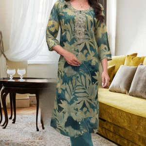 Introducing the Naurad Leaf Reverie Kurta Set—a harmonious blend of tradition and modern elegance. This set features a soothing teal and beige palette, adorned with artistic leaf motifs that evoke an effortless sense of renewal and grace. Crafted from breathable, lightweight fabric, the kurta boasts a flattering straight silhouette, three-quarter sleeves, and a delicately embroidered neckline for a touch of artisanal sophistication.