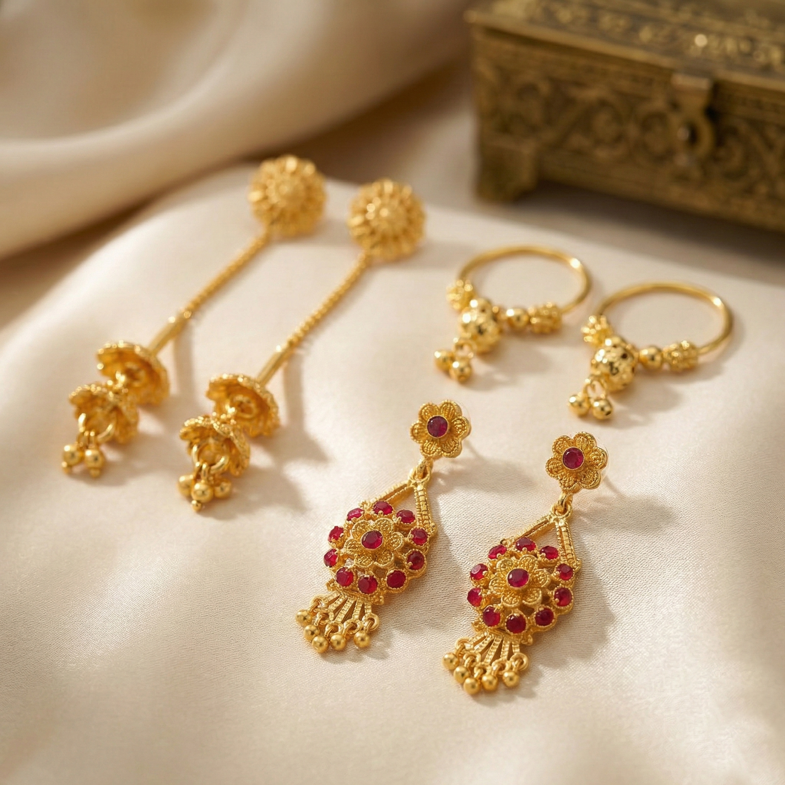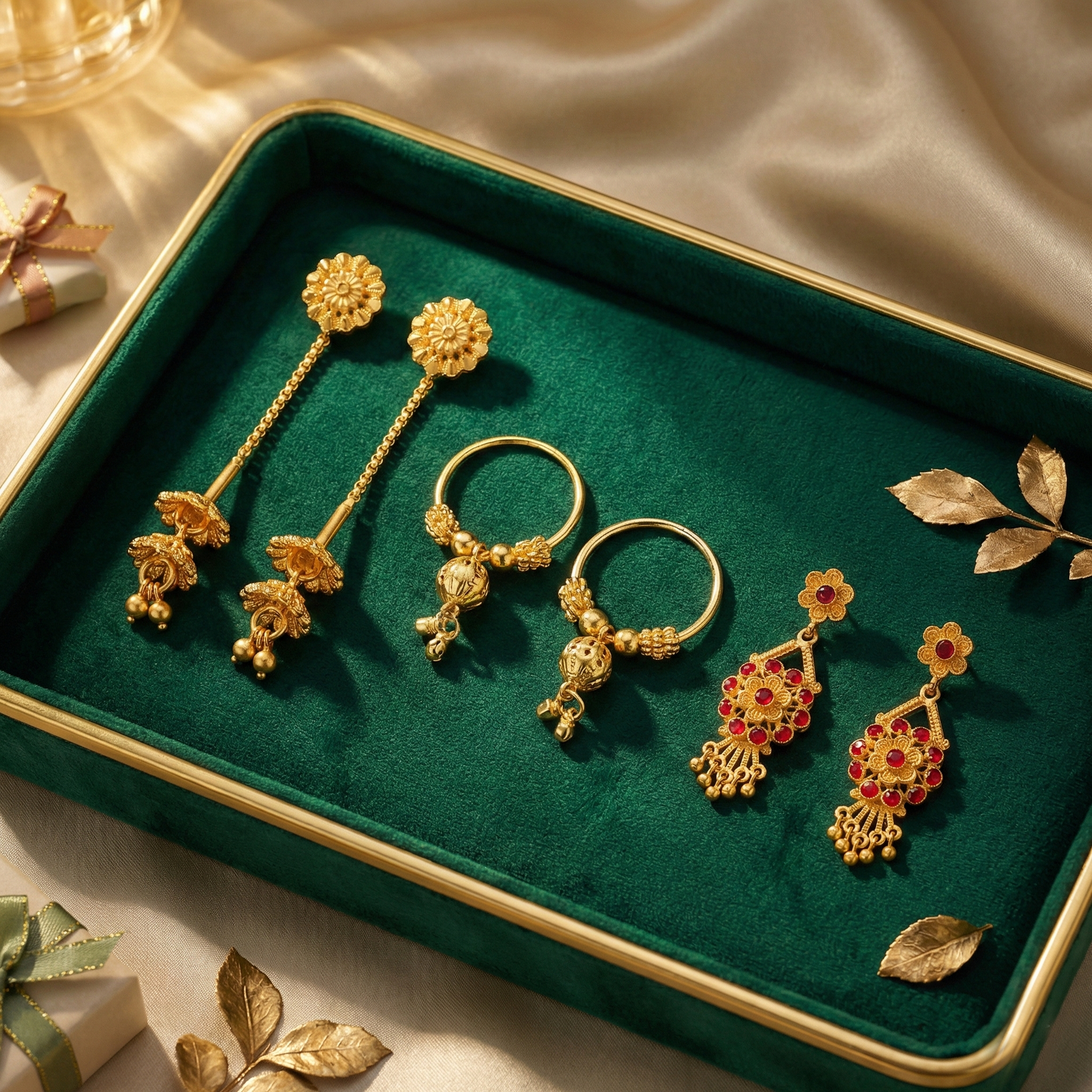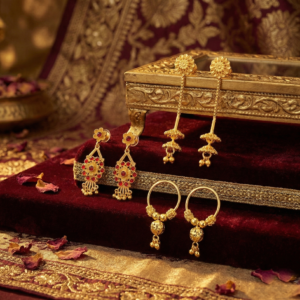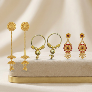 Royal Red Stone Drops: Intricate floral drop earrings embedded with ruby-red stones, adding a pop of color to your festive and ethnic attire.