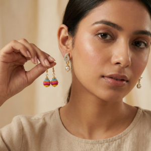 The Playful Boho: Gold-tone hook earrings featuring a stack of vibrant pink, blue, orange, and yellow beads. Perfect for brightening up a casual kurta or a summer dress.