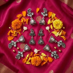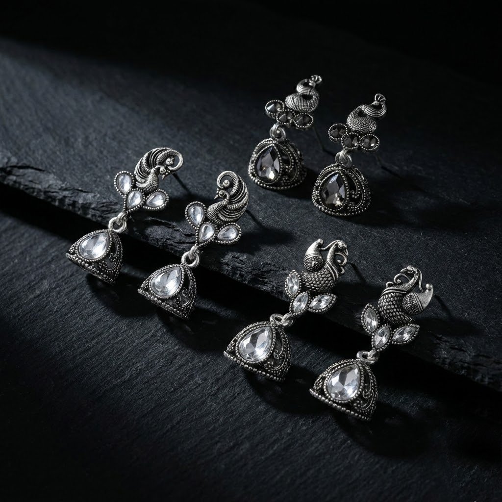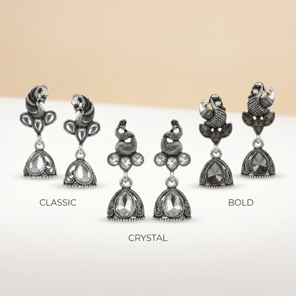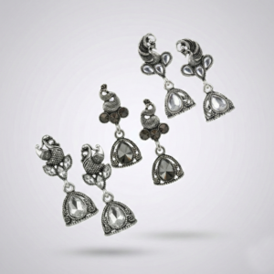 Be the first to review “Naurrad Oxidized Silver Plated Peacock Jhumka Earrings Combo of 3 Pairs – Ethnic Black & Clear Crystal Drop Jhumki Set for Women and Girls”