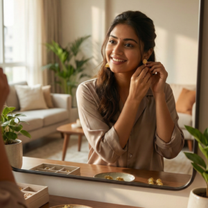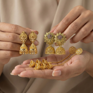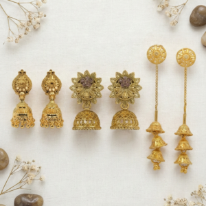 Classic Filigree Jhumka: A timeless piece featuring detailed gold work and small hanging ghungroos. Perfect for a traditional puja or family gathering.